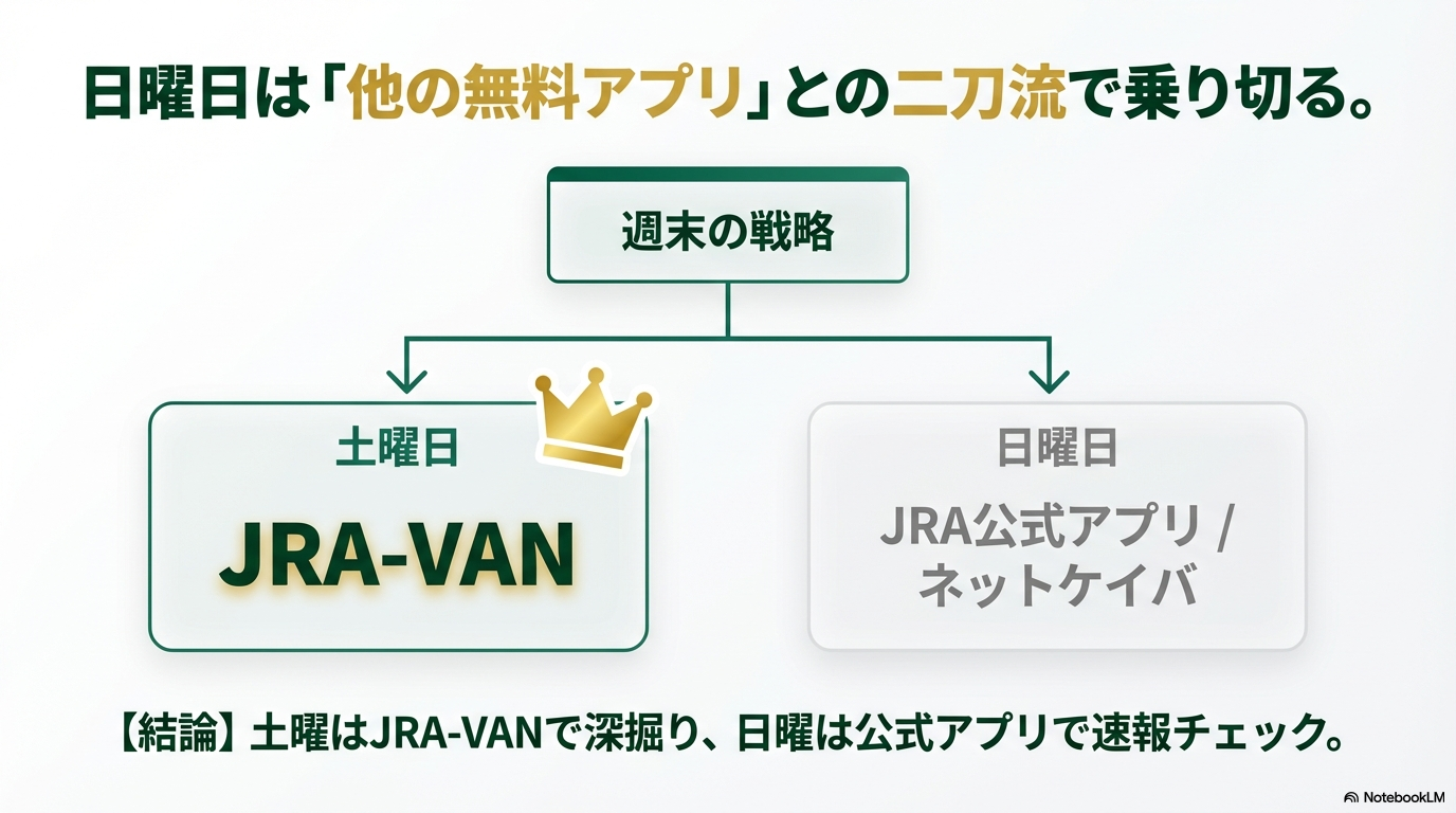 完全無料重視 土曜日はJRA-VAN、日曜日はJRA公式アプリ コスト0円で公式データと動画をカバー