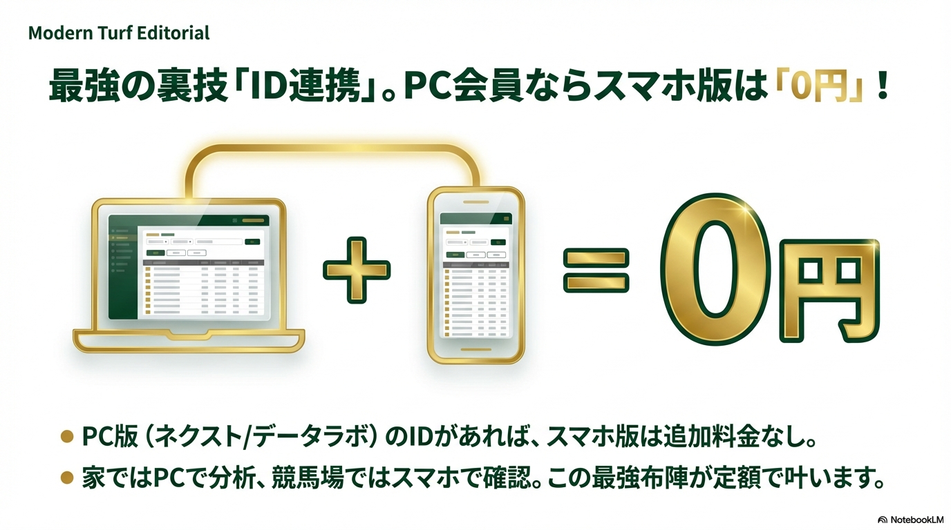 もしあなたがPC版の「ネクスト」や「データラボ」をすでに利用しているなら、スマホアプリの料金を個別に支払う必要は一切ありません。これこそが、運営元であるJRAシステムサービスが公式に認めている「スマホ版を実質無料で使い続ける最強の裏技(優待制度)」なんです。
