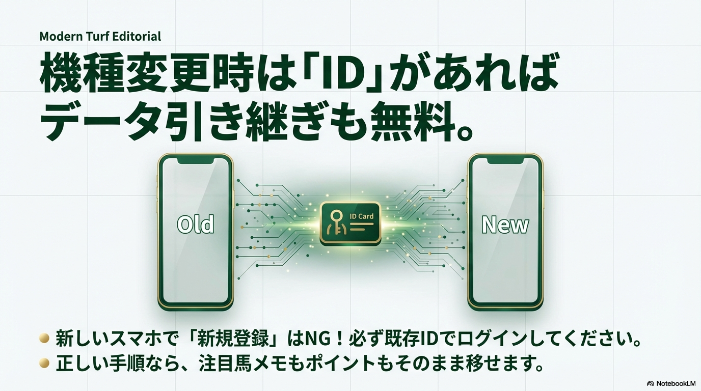 この仕組みの素晴らしいところは、iPhoneからiPhoneといった同じOS間の移動はもちろん、iPhoneからAndroid、あるいはAndroidからiPhoneといった異なるOS間での機種変更であっても、正しい手順を踏めば無料でスムーズに元通りにできる点です。私たちの予想の核となる「My注目馬」のメモや、コツコツ貯めたポイントは、端末ではなくJRA-VAN側のサーバーに保存されているからなんですね。ただし、この「JRA-VAN ID」を正しく管理していないと、せっかくの資産を失うことになりかねないので、慎重に進めていきましょう。
