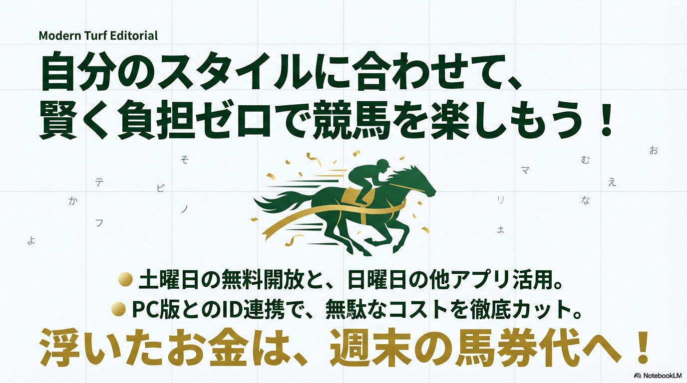 結局のところ、「土曜日はJRA-VANの無料開放でディープなデータを拾い、日曜日はJRA公式アプリとnetkeibaで補完する」。この波状攻撃こそが、現代の競馬ファンに許された知的なコスト削減術なのかなと思います。無理に有料会員に縛られる必要はありません。自分の予想スタイルに合わせて、これらの優秀な無料アプリをパズルのように組み合わせてみてください。そうすれば、月額費用を抑えつつ、より納得感のある予想ができるようになるはずです!