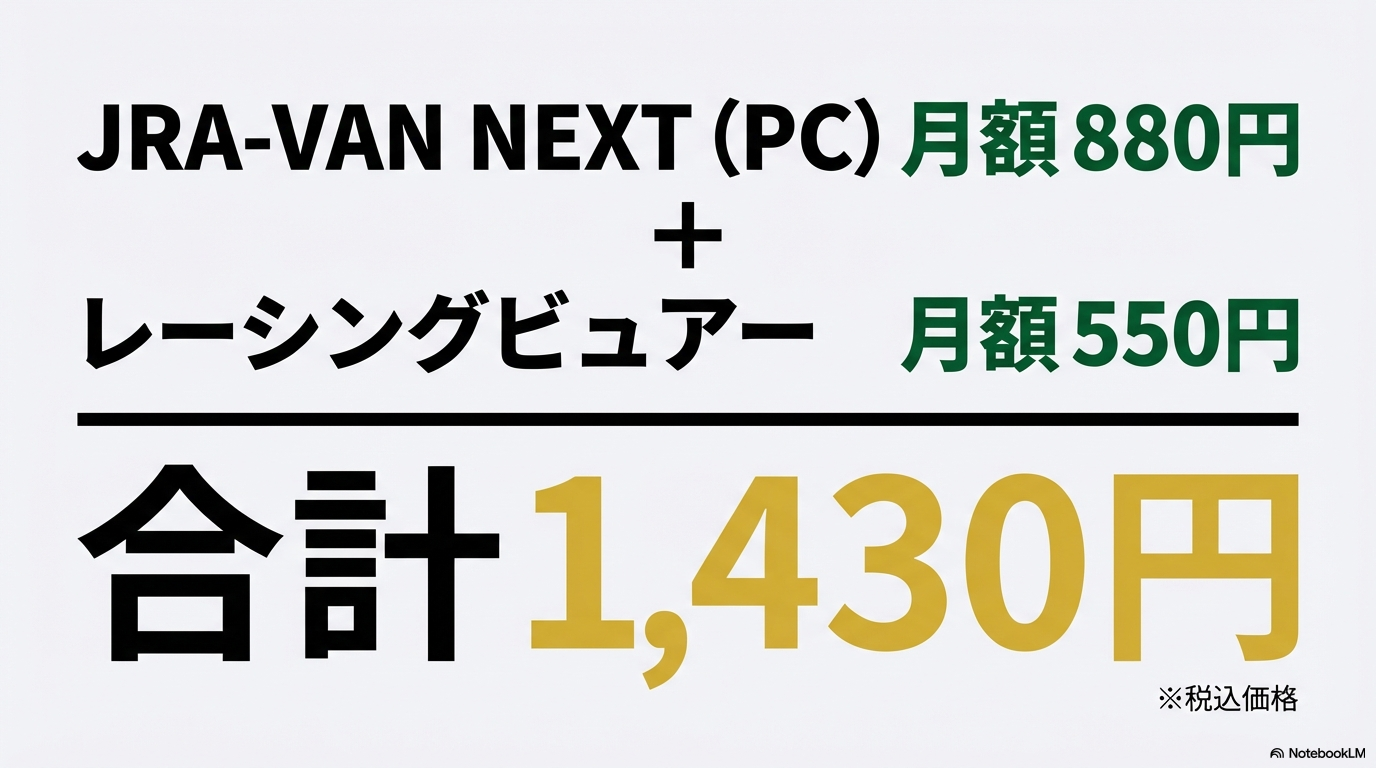 具体的な料金の組み合わせを見てみましょう。PC版のスタンダードであるJRA-VAN NEXT(月額880円)にレーシングビュアー(月額550円)を追加すると、合計で月額1,430円(税込)になります。一方で、プロ仕様のDataLab.(データラボ)派の方であれば、月額2,090円に550円を足して、合計2,640円(税込)となります。どちらのケースでも、単体でそれぞれ契約するのと月々の支払額は変わりませんが、一括払いの割引を適用させることでさらにお得に運用することも可能です。