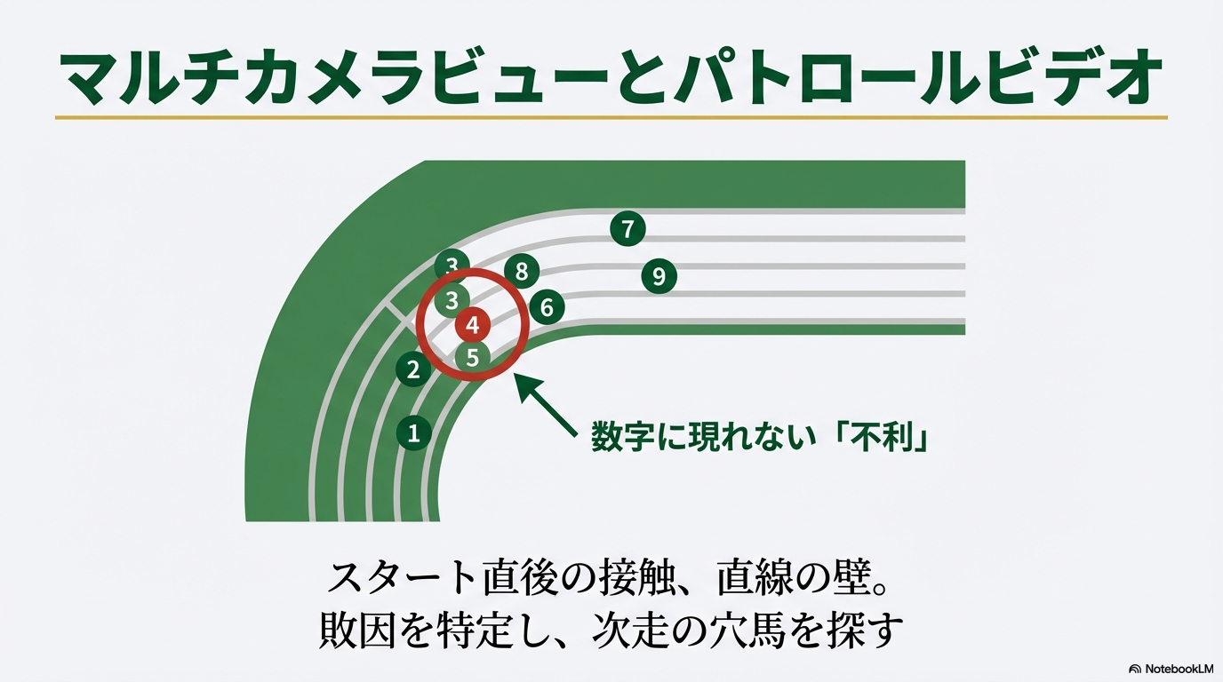 特に私が注目しているのは、「ジョッキーが追うのをやめたタイミング」や「進路取りのミス」です。スタンダード映像では一瞬の出来事に見えても、パトロールビデオなら「あ、ここで進路が狭くなって完全に勢いが死んだな」という決定的な瞬間が手に取るようにわかります。