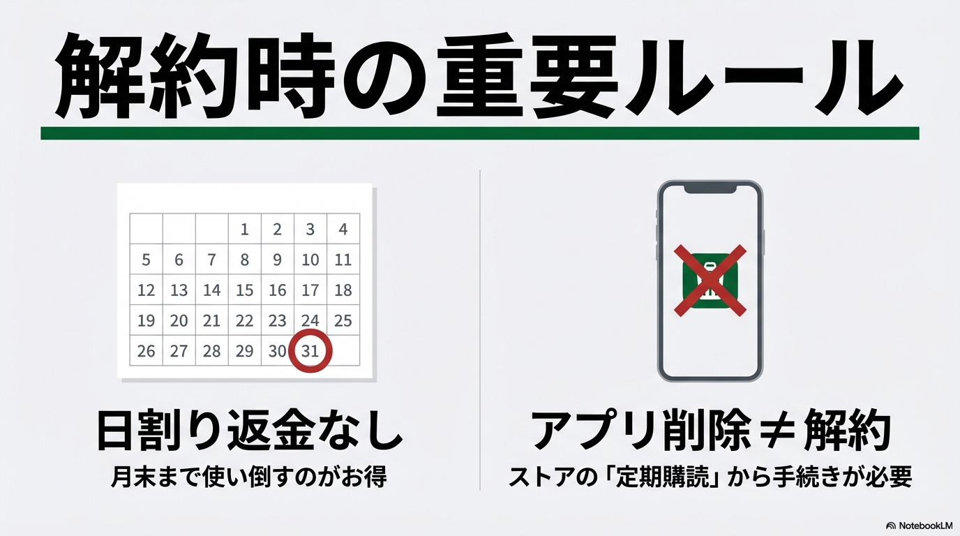 まず、最も重要なルールとして覚えておきたいのが、「日割り計算による返金は一切ない」という点です 。たとえば月の初めの1日に解約手続きを完了させたとしても、その月の利用料は1ヶ月分満額が発生します。その代わり、手続き後もその月の末日(有効期限内)まではサービスを利用し続けることができる仕組みになっています。ですので、もし解約を決めたのであれば、月末ギリギリまで使い倒してからお別れするのが最も経済的です。