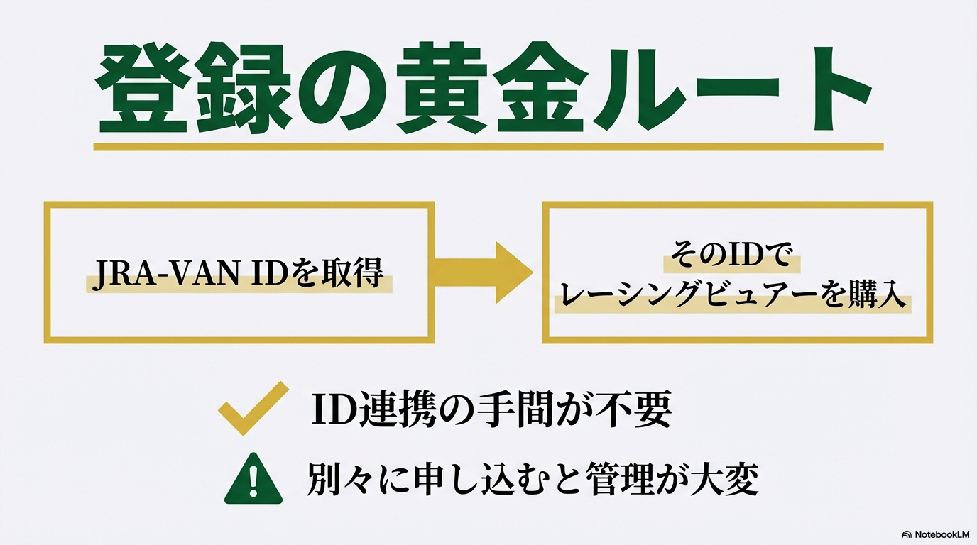 JRA-VANとレーシングビュアーを使い始めるにあたって、実は一番トラブルが起きやすく、かつ慎重に進めてほしいのが「登録の手順とIDの紐付け」です。マークアップエンジニアの視点で見ると、ここの導線設計が少し特殊なので、適当に進めてしまうと「ログインできない」「二重に課金してしまった」といった事態を招きかねません。私自身の経験も踏まえ、最も効率的で間違いのない進め方を徹底的に深掘りしてお伝えしますね。
