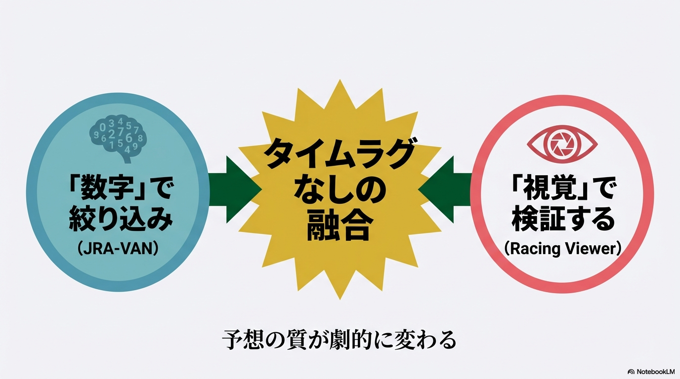 JRA-VANとレーシングビュアーをセットで使うと、予想の質が劇的に変わります。なぜなら、「数字(データ)」と「視覚(映像)」をタイムラグなしに融合できるからです。私自身、この連携を使い始めてから、ただ馬柱を眺めるだけの時とは比較にならないほど納得感のある予想ができるようになりました。