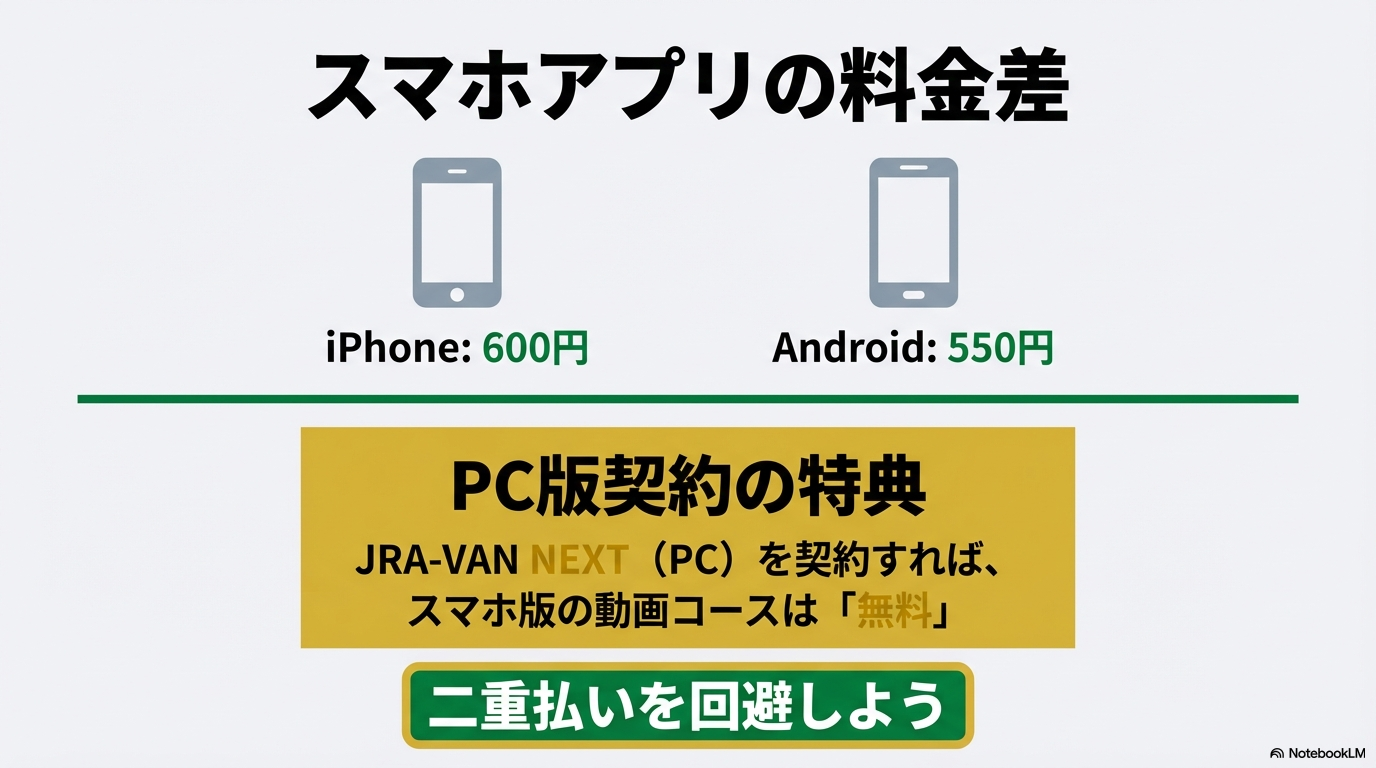 ここで一つ、私が見つけた大きな節約ポイントをお教えしますね。実は、PC版の「JRA-VAN NEXT(月額880円)」を契約すると、特典としてスマートフォンアプリ版の動画コースが追加料金なしで利用できるようになります。つまり、PC版を契約していれば、スマホ版で別途600円を払う必要がなくなるんです。この仕組みを賢く利用すれば、自宅のPCでも移動中のスマホでも、常に最新のデータと映像を追いかけることが可能になりますよ。