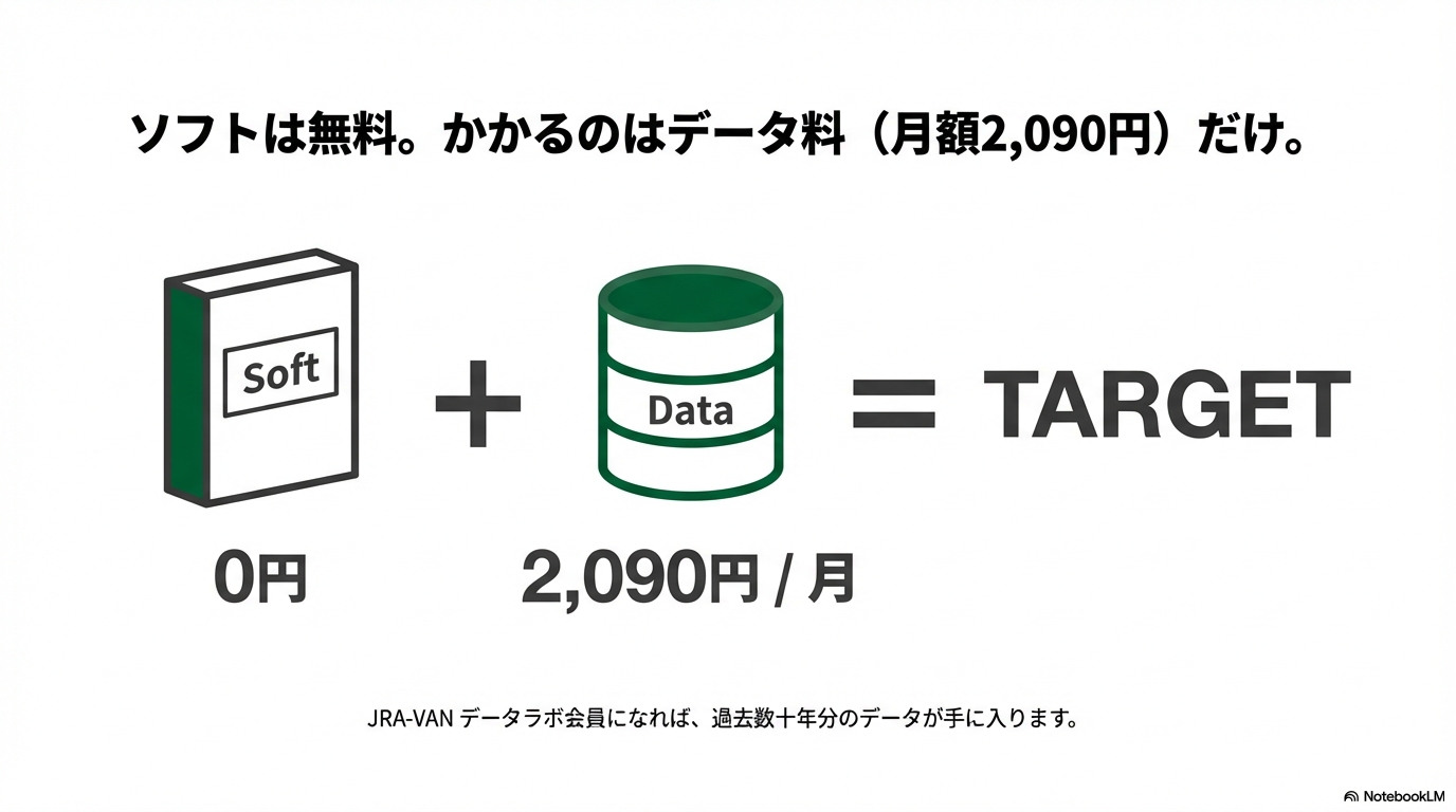 まず大前提として理解していただきたいのが、TARGETというソフトウェア自体は「無料」でダウンロードできるという事実です。しかし、ダウンロードしただけではTARGETはただの「空の箱」です。中身である「過去数十年分のレースデータ」や「今週末の出馬表・オッズ」を受信して初めて、強力な分析ツールとして機能します。