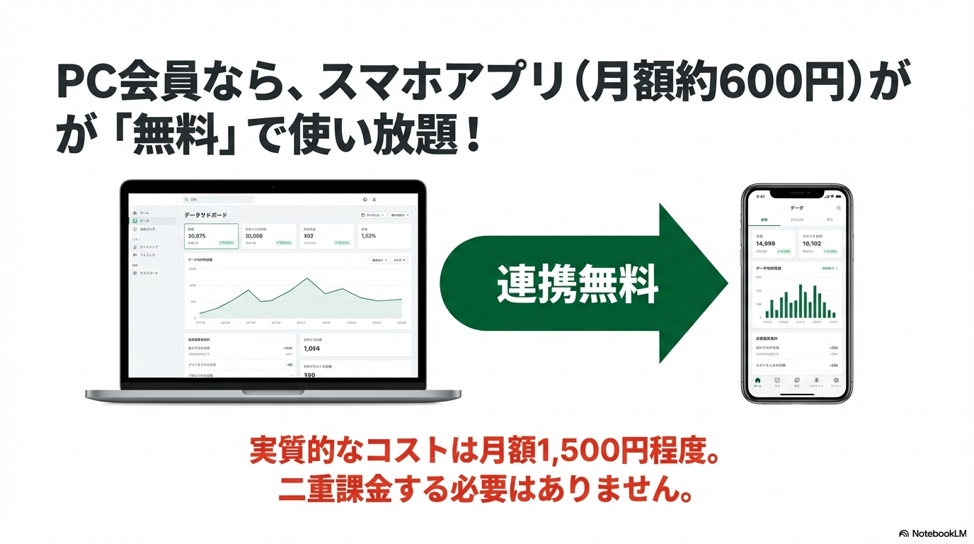つまり、PCで本格分析をしつつ、外出先ではスマホで快適に情報収集をするという「二刀流」スタイルを実現する場合、実質的なPC版のコストは1,500円程度と考えられます。