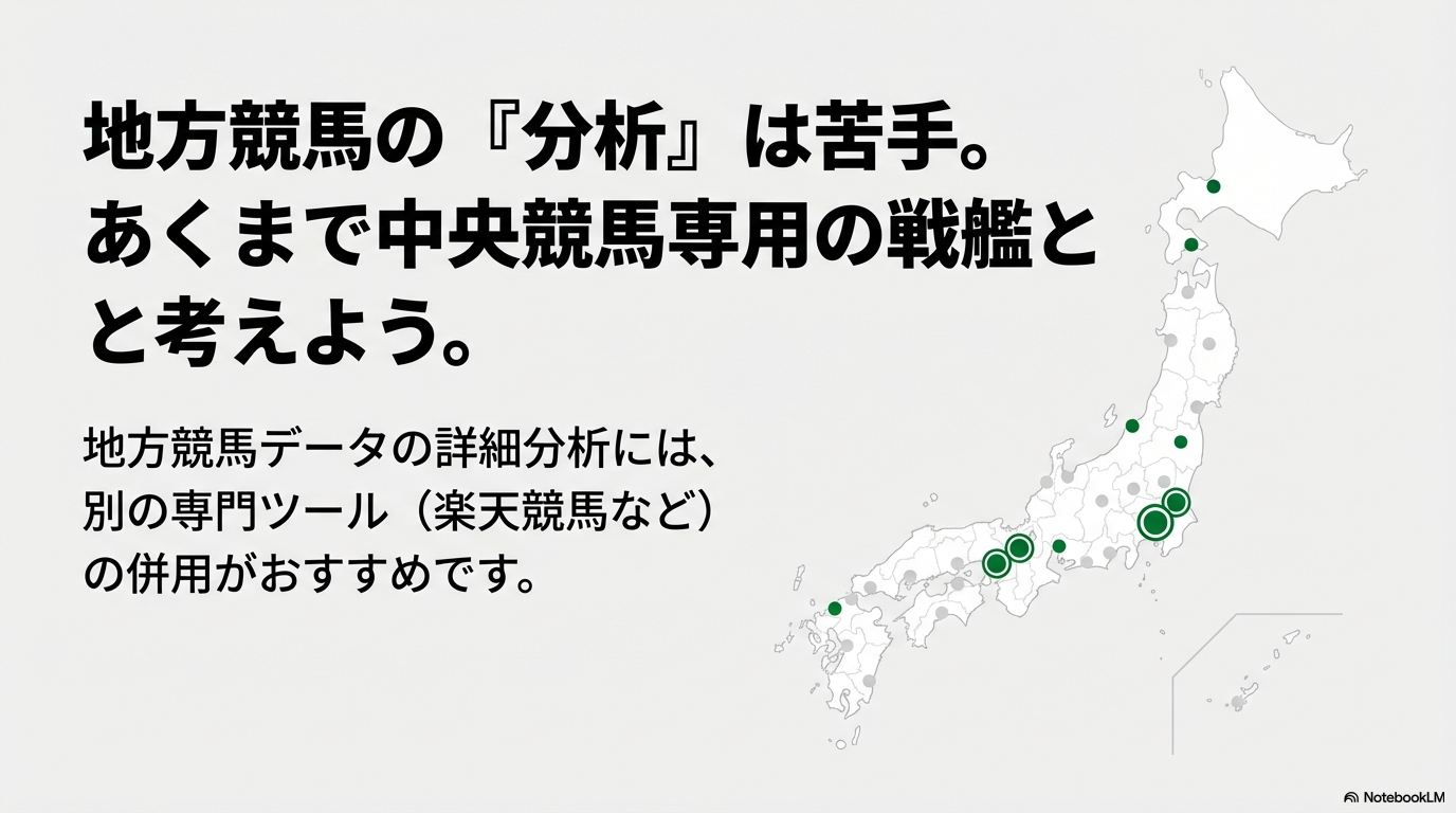 また、現代の競馬ファンにとって欠かせない「スマートフォンとの連携」や、地方競馬のデータには対応しているのかといった点も、導入前にクリアにしておきたい重要なポイントでしょう。