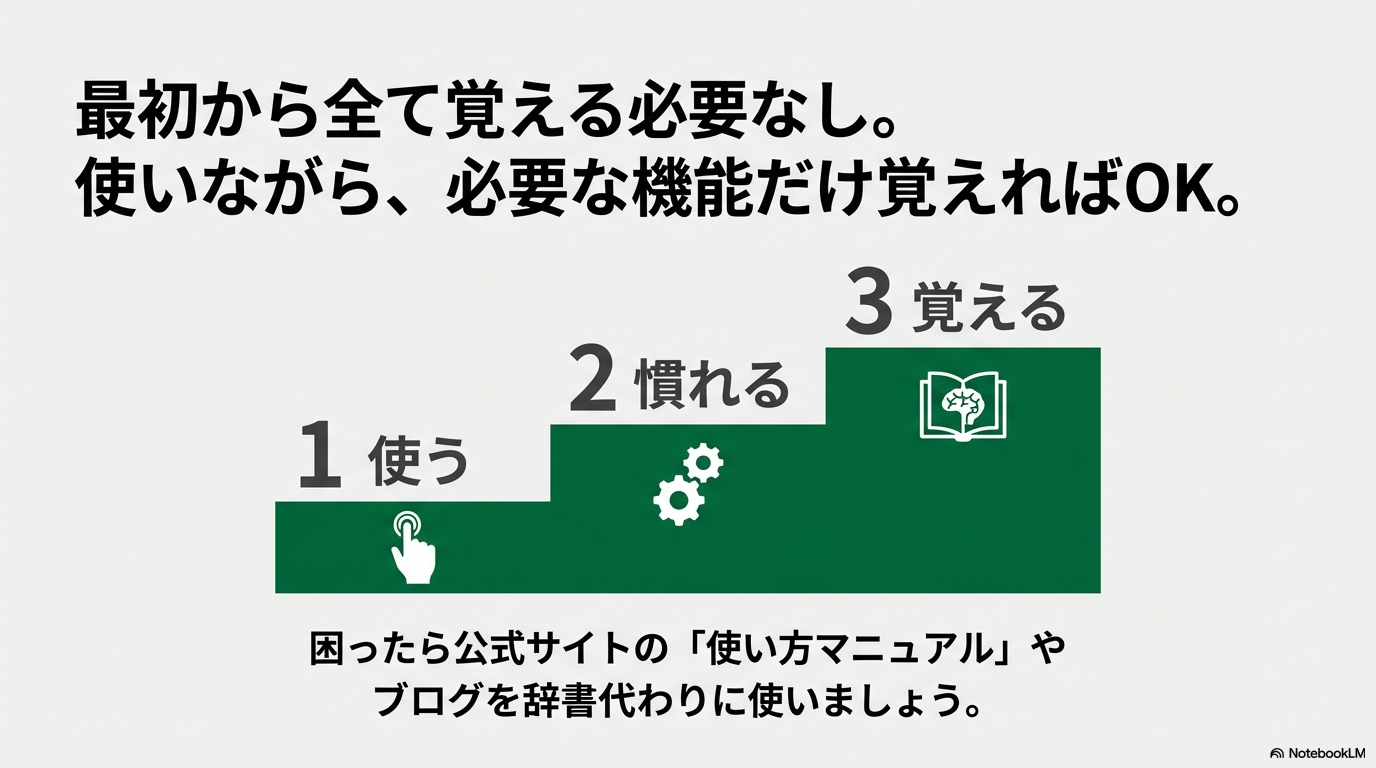 - 困った時だけ公式マニュアル: エラーが出たり、複雑な検索条件が作れない時だけ、辞書を引きます。