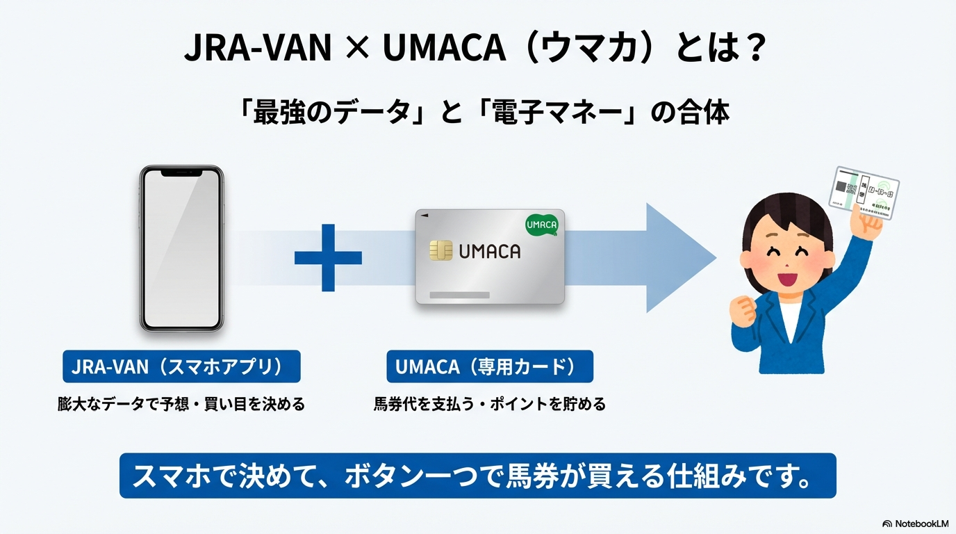 JRA-VANのスマホアプリとUMACAスマートを連携させることで、私たちの競馬ライフは驚くほど効率的になります。そもそも「UMACAスマート」とは、JRAのキャッシュレス投票用ICカードである「UMACA」の残高を使い、スマートフォンやパソコンから馬券を購入できるサービスのこと。これをJRA-VANアプリと紐付ける最大のメリットは、「膨大なデータによる予想の検討」から「実際の投票決済」までをアプリ一つで垂直統合できる点にあります。