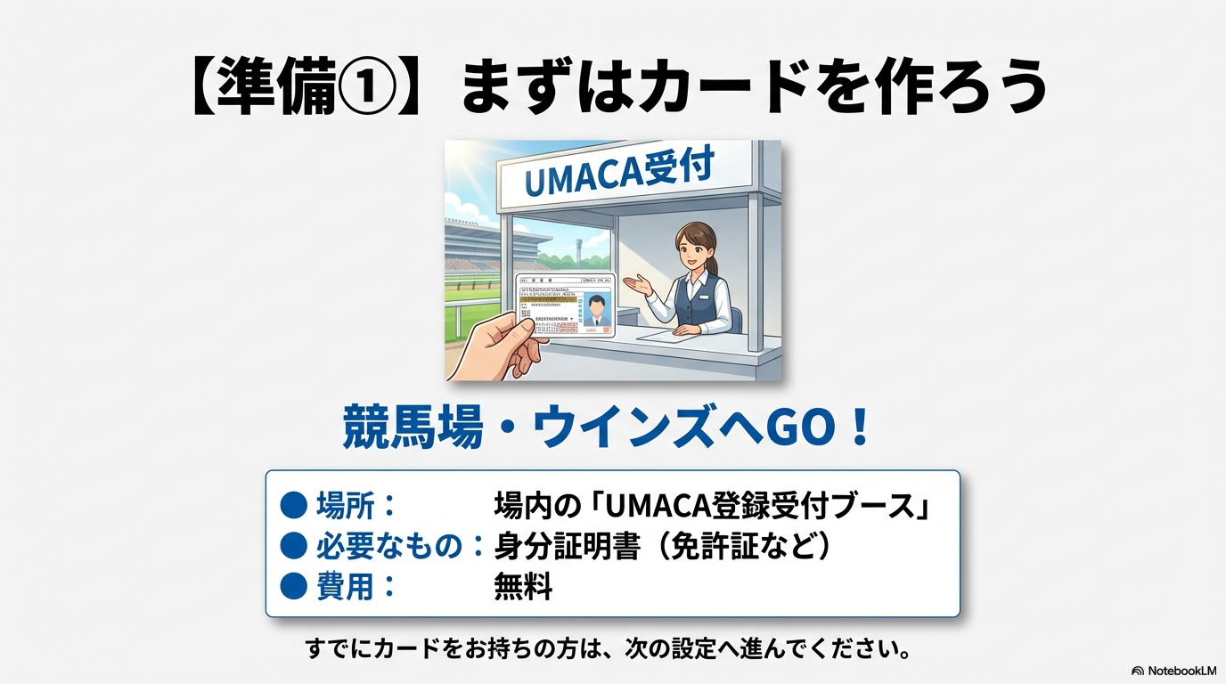 - 競馬場やウインズの登録ブースで、まずは物理的な「UMACAカード」を無料作成します。