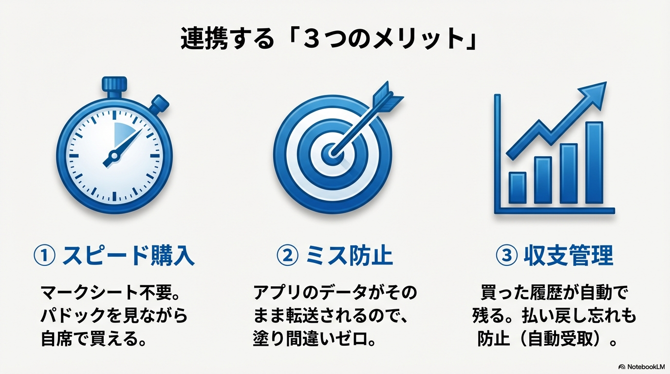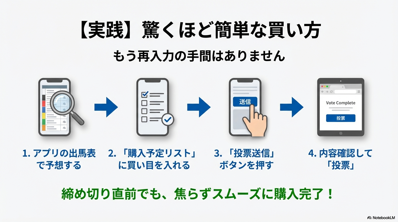 このスピード感と確実性は、単なる「便利さ」を超えて、予想の精度やメンタル面にも良い影響を与えてくれます。締切時刻のプレッシャーに負けて「適当な金額で買ってしまう」といったミスを物理的に防げるからです。