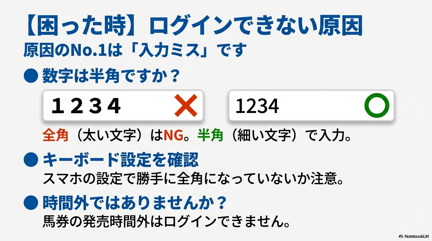 競馬場での勝負は時間との戦い。パドックを見て、JRA-VANでデータを最終確認し、「よし、これでいくぞ!」と投票画面を開いた瞬間にエラーが出てログインできない……。これは、競馬ファンにとって最も心臓に悪い瞬間の一つですよね。私もかつて、締め切り3分前にログインできず、結局買えなかったレースで本命馬が1着に来るという悲劇を経験したことがあります。そんなパニックを未然に防ぎ、もし起きてしまった時でも冷静に対処できるよう、原因と解決策を徹底的に深掘りしてお話ししますね。まずは落ち着いて、一つずつ原因を切り分けていきましょう。