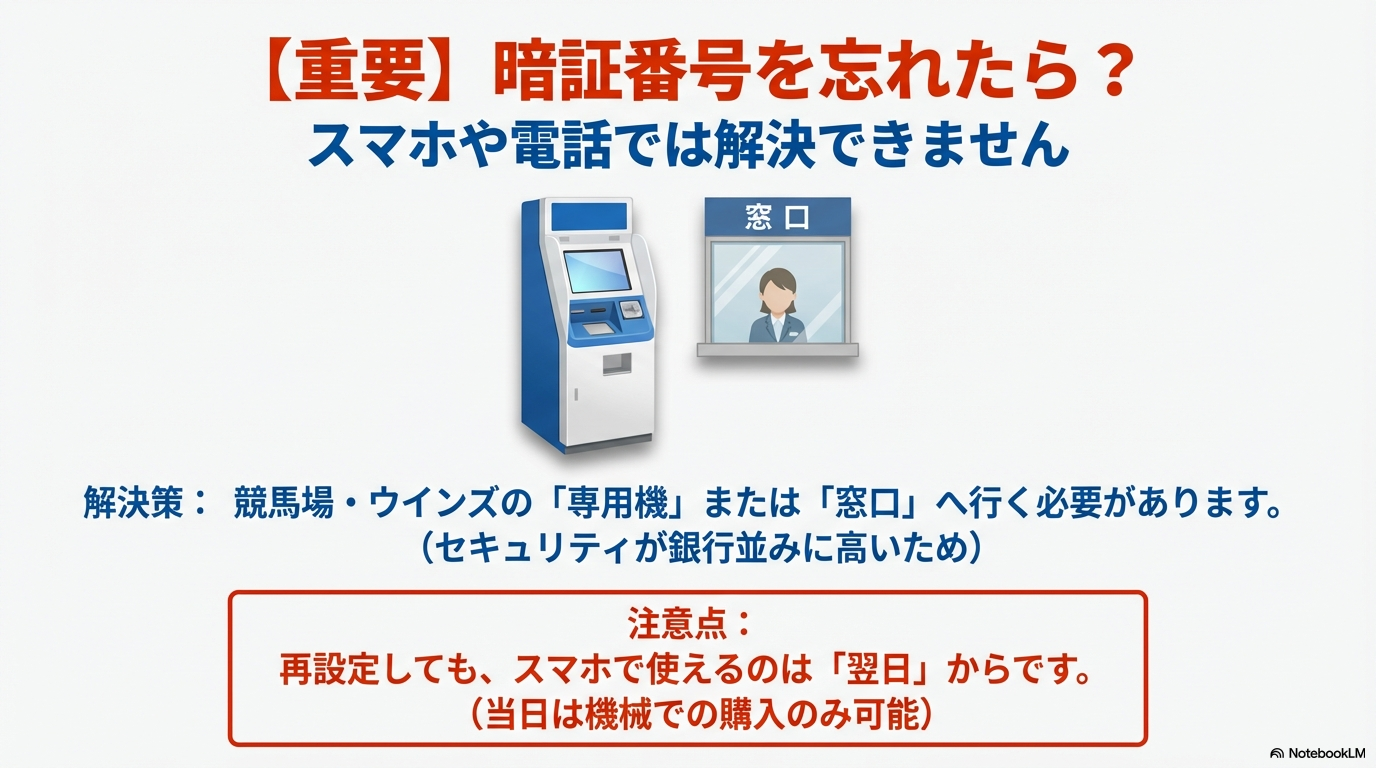 | UMACA暗証番号 | 新しい端末で再入力 | 忘れると競馬場での再設定が必要 |