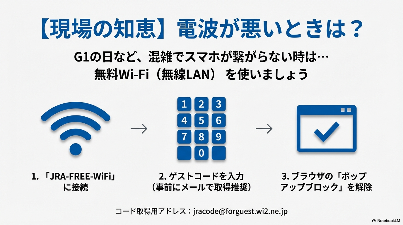 - 現場の通信確保:大きなレースの日は事前に「JRA-FREE-WiFi」のゲストコードを取得しておく