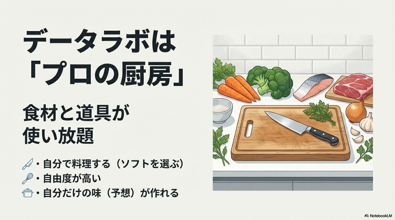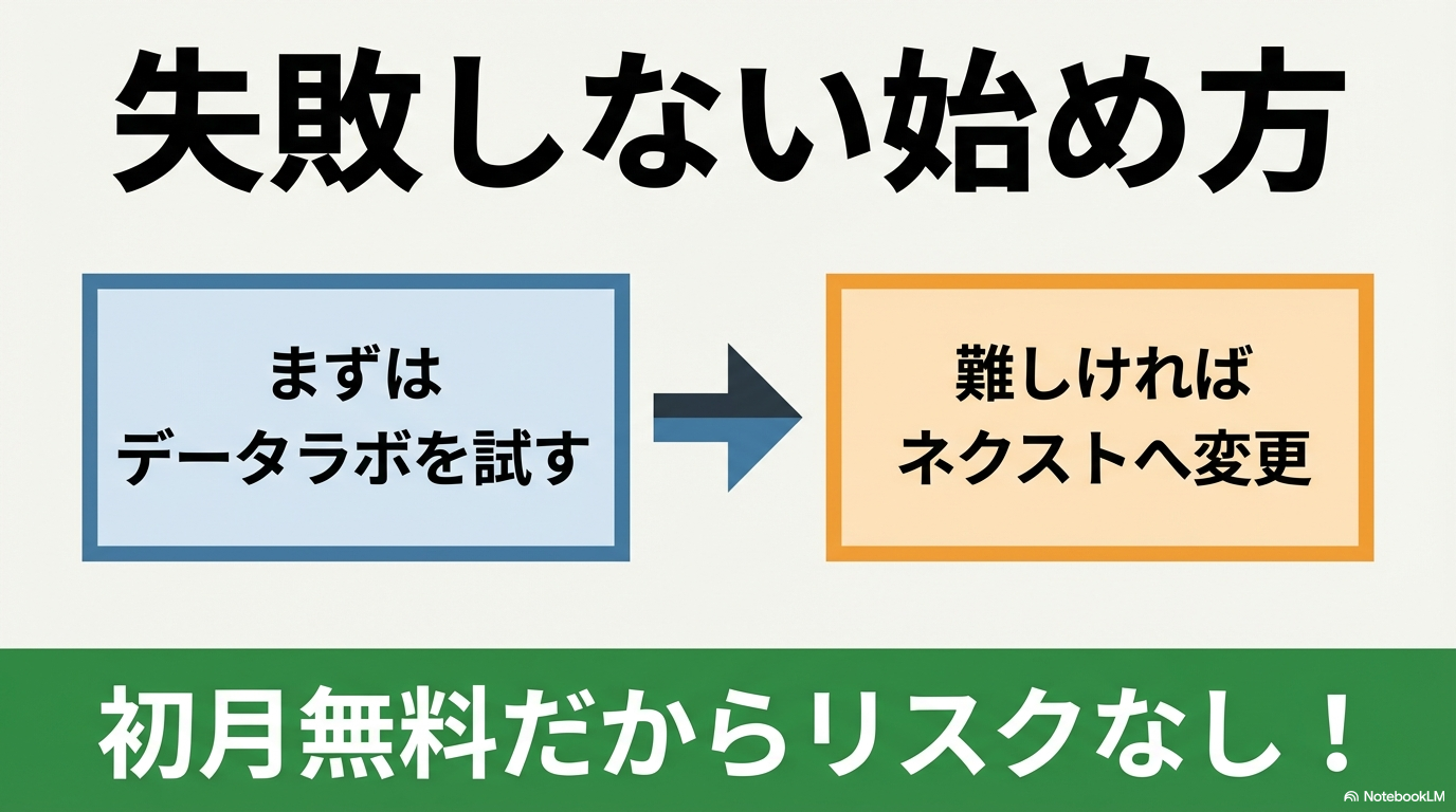 - 「データから法則を見つけ出す」「回収率のシミュレーションをする」レベルを目指すなら Data Lab. へのステップアップが必要。