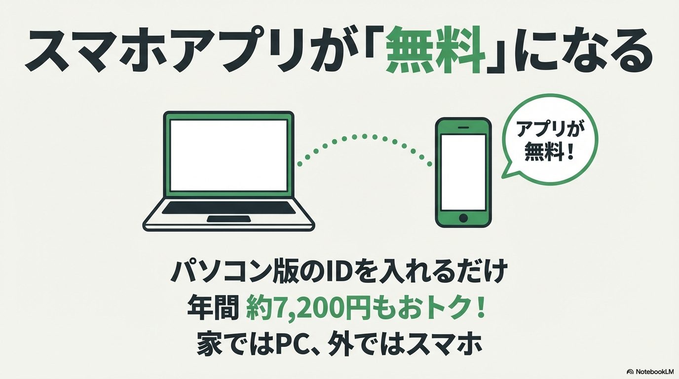 これ、意外と知らずに「PC版は2,090円、スマホ版は別途600円」と二重に支払ってしまっている方が結構いらっしゃるんですよね。非常にもったいないです!実は、PC版の会員IDを持っていれば、有料のスマホアプリ(通常iOS版:月額600円、Android版:月額550円)が、追加料金ゼロで完全に使い放題になるんです。