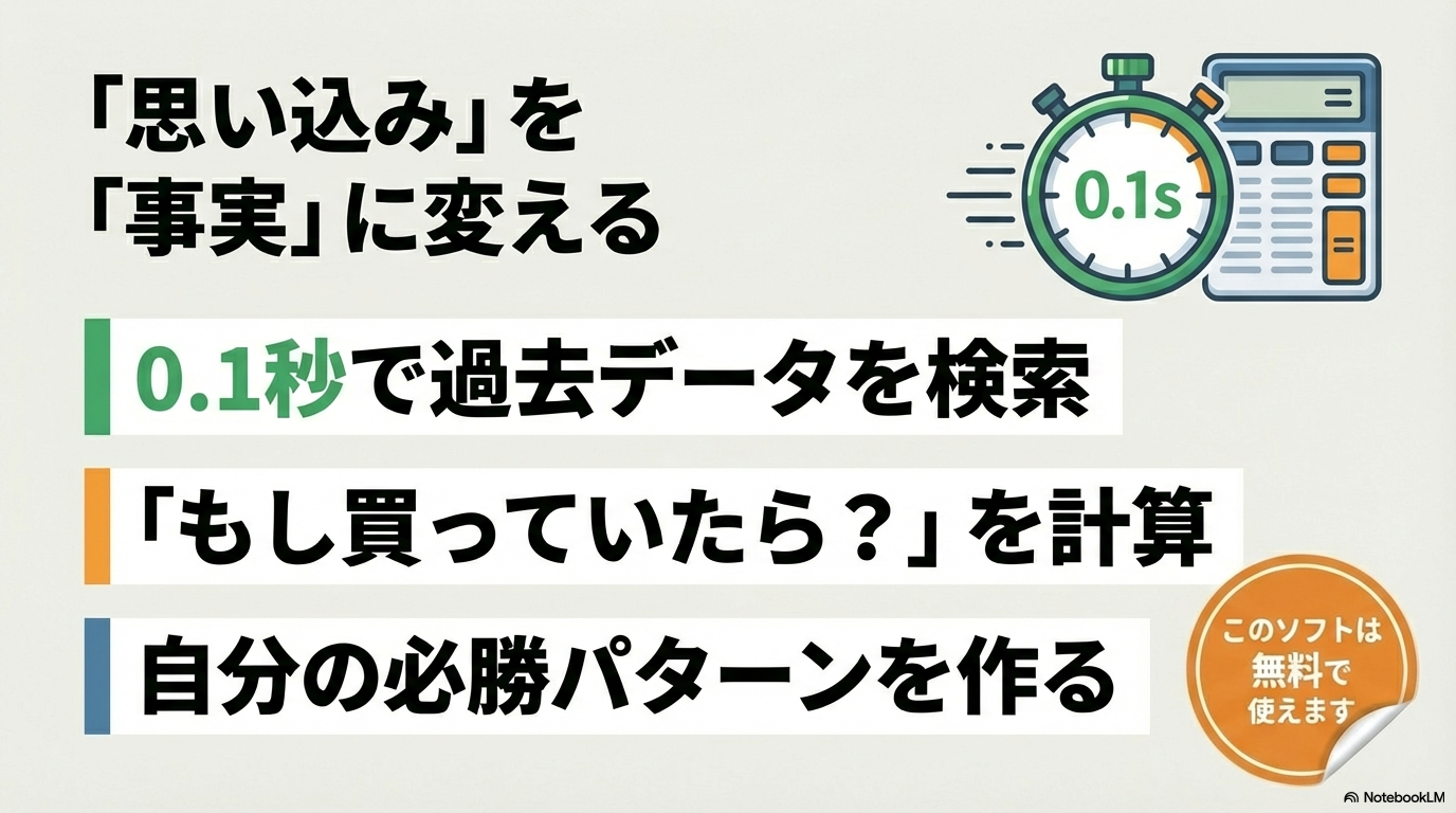 もしあなたが、「自分だけの必勝法を作りたい」「感情に左右されずに投資として競馬に取り組みたい」と考えているなら、Data Lab.を選び、TARGET frontier JVを使いこなすことが必須条件となります。なぜなら、ロジックを作るための「仮説検証」のサイクル(仮説を立てる→過去データで検証する→修正する)は、データベースソフトでなければ絶対に回せないからです。