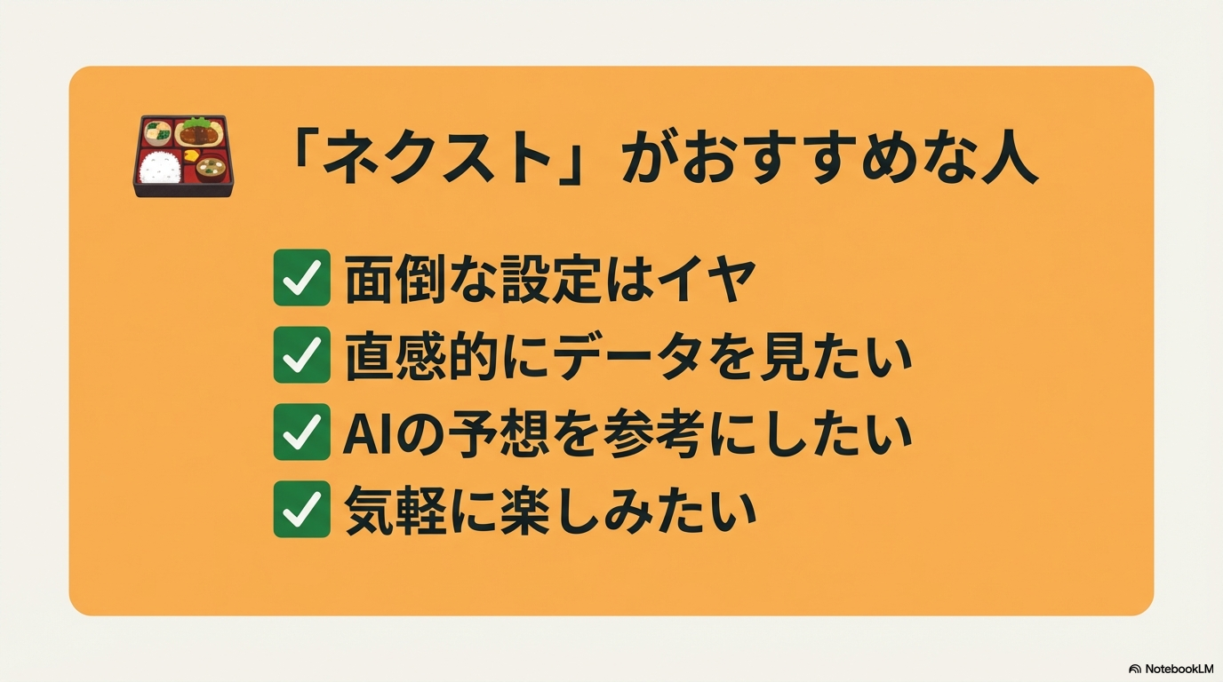 - 「データを見て楽しむ」「予想の参考にする」レベルなら NEXT で十分。