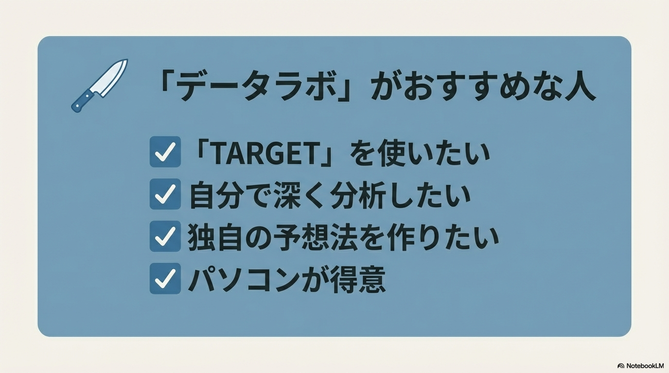 自分で計算式を組むのは面倒だけど、AIが弾き出した高精度の予測スコア(データマイニング)は参考にしたい、という「いいとこ取り」をしたい方に向いています。 - 週末エンジョイ勢(ライト〜ミドル層)