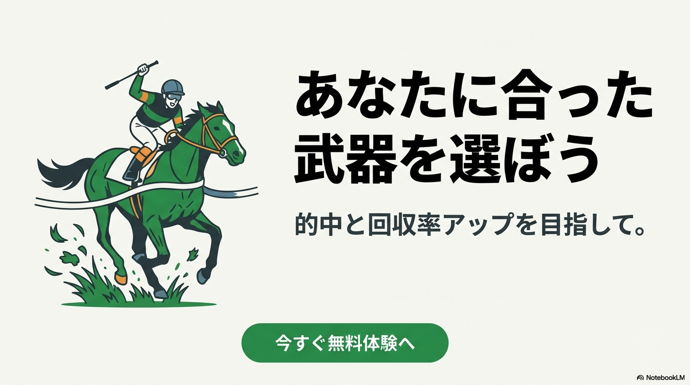 間違った方を選んでしまうと、「やりたいことができない」「難しすぎて使いこなせない」といったミスマッチが起きてしまいます。逆に、自分のスタイルに合った方を選べば、競馬予想の精度も楽しみ方も劇的に進化することは間違いありません。