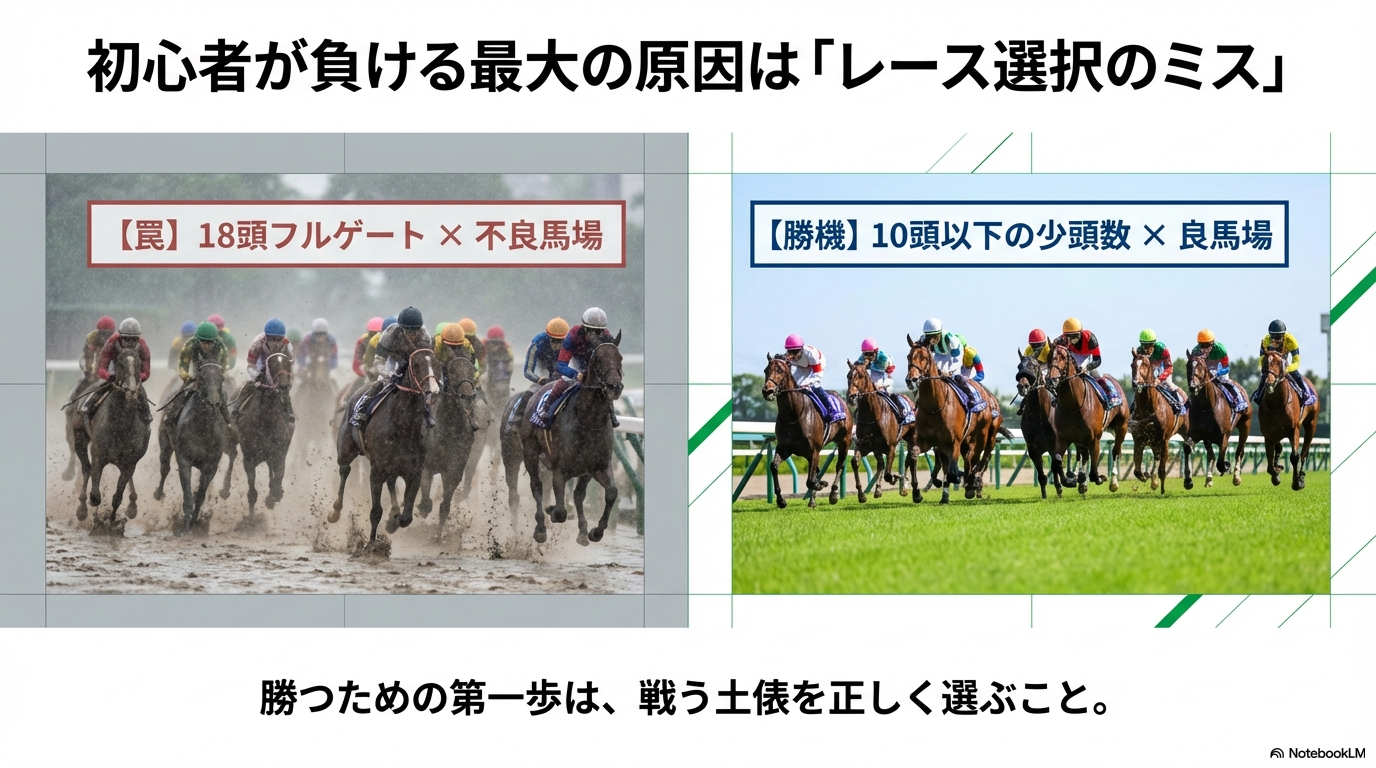 初心者のうちは、変数が多すぎるレースは「見(ケン=買わずに見るだけ)」することも立派な戦略です。「少頭数」かつ「良馬場」。まずはこの2つの条件が揃ったレースに絞ってチャレンジしてみてください。それだけで、あなたの馬券収支は劇的に安定するはずです。