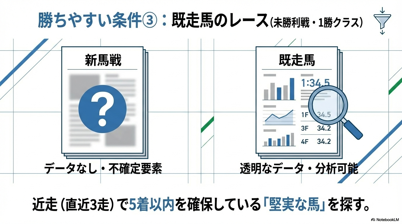 雨や雪の影響を受けた馬場は、馬によって得意不得意が激しく分かれます。スピード能力が素直に反映される「良馬場」を選ぶことで、「強い馬が勝つ」というシンプルな予想が成立しやすくなります。 - 新馬戦よりも、過去データがある既走馬のレースを選ぶ(情報の透明性)