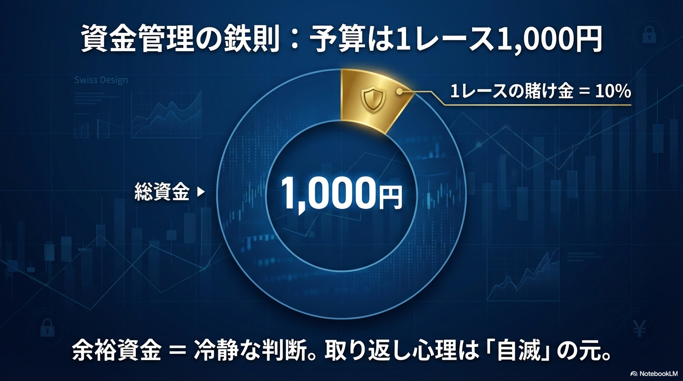 1レースの予算は「軍資金の10%(目安は1,000円)」以内に設定します。熱くなって資金を全投入するのを防ぎ、長く楽しむためのメンタル防衛術です。 - 武器となる買い方:
