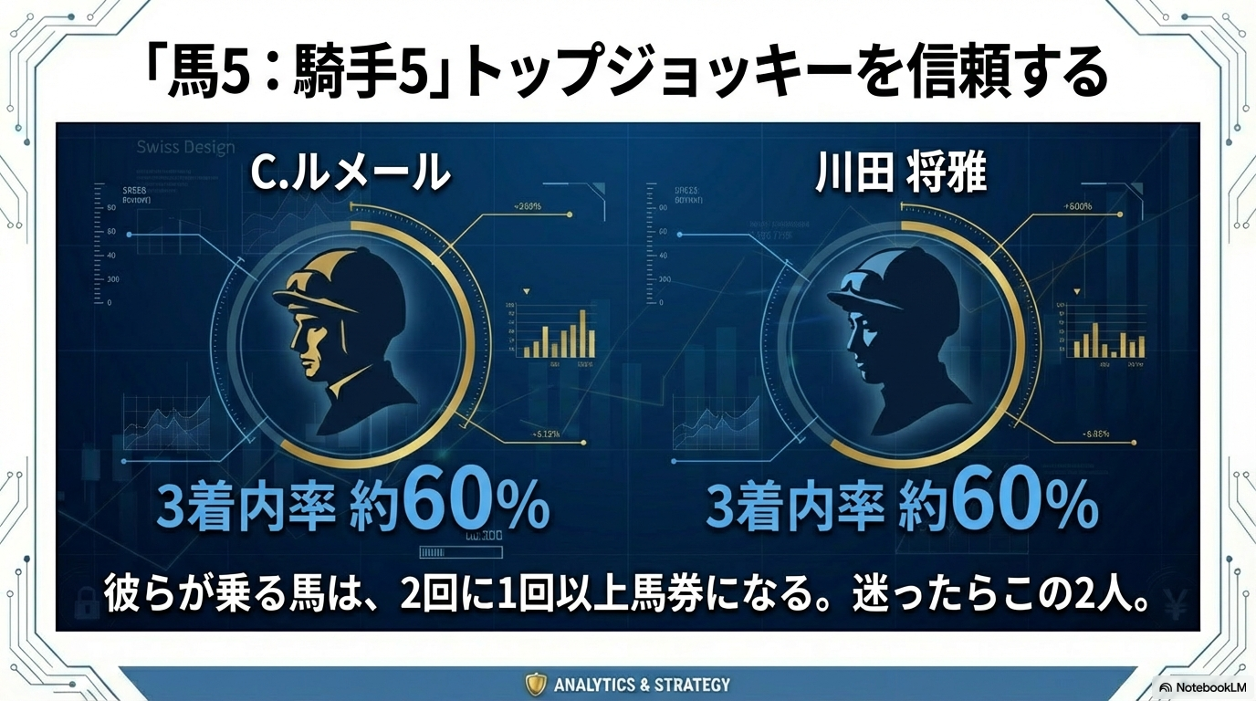 これはどういうことかと言うと、「彼らが乗っている馬を買えば、2回に1回以上の確率で3着以内に来る」という計算になります。競馬は18頭立てなら当たる確率は単純計算で約16%(複勝)しかないゲームです。その中で、騎手を選ぶだけで確率を60%近くまで引き上げられるというのは、統計的に見てとてつもないアドバンテージです。