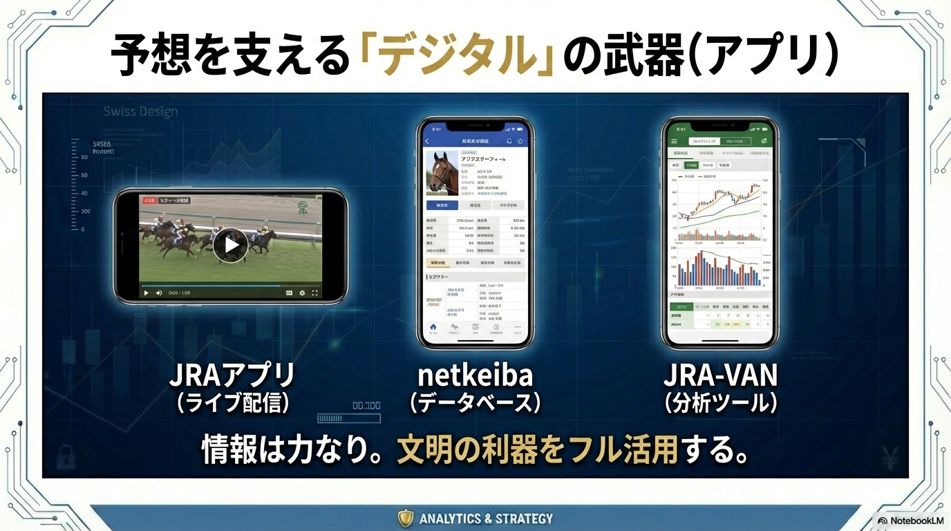 「JRA-VAN」や「netkeiba」などのアプリを駆使し、勘ではなくデータ(騎手の複勝率など)に基づいた根拠のある予想を組み立てます。 - 体験価値の最大化: