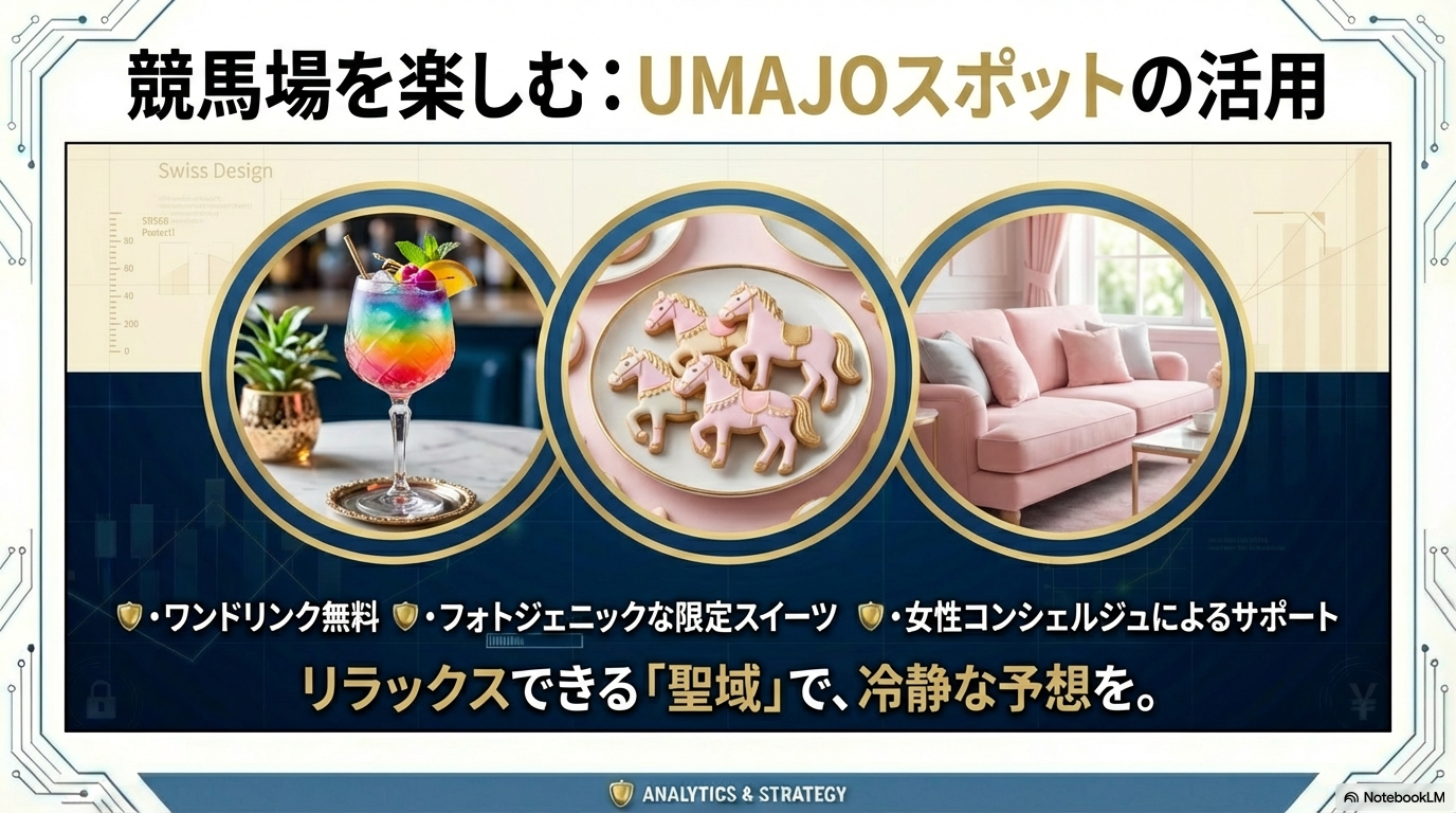 的中だけがゴールではありません。競馬場の絶品グルメに舌鼓を打ったり、UMAJOスポットでリラックスしたりと、空間そのものを楽しむ余裕を持つことが、結果的に良い予想に繋がります。