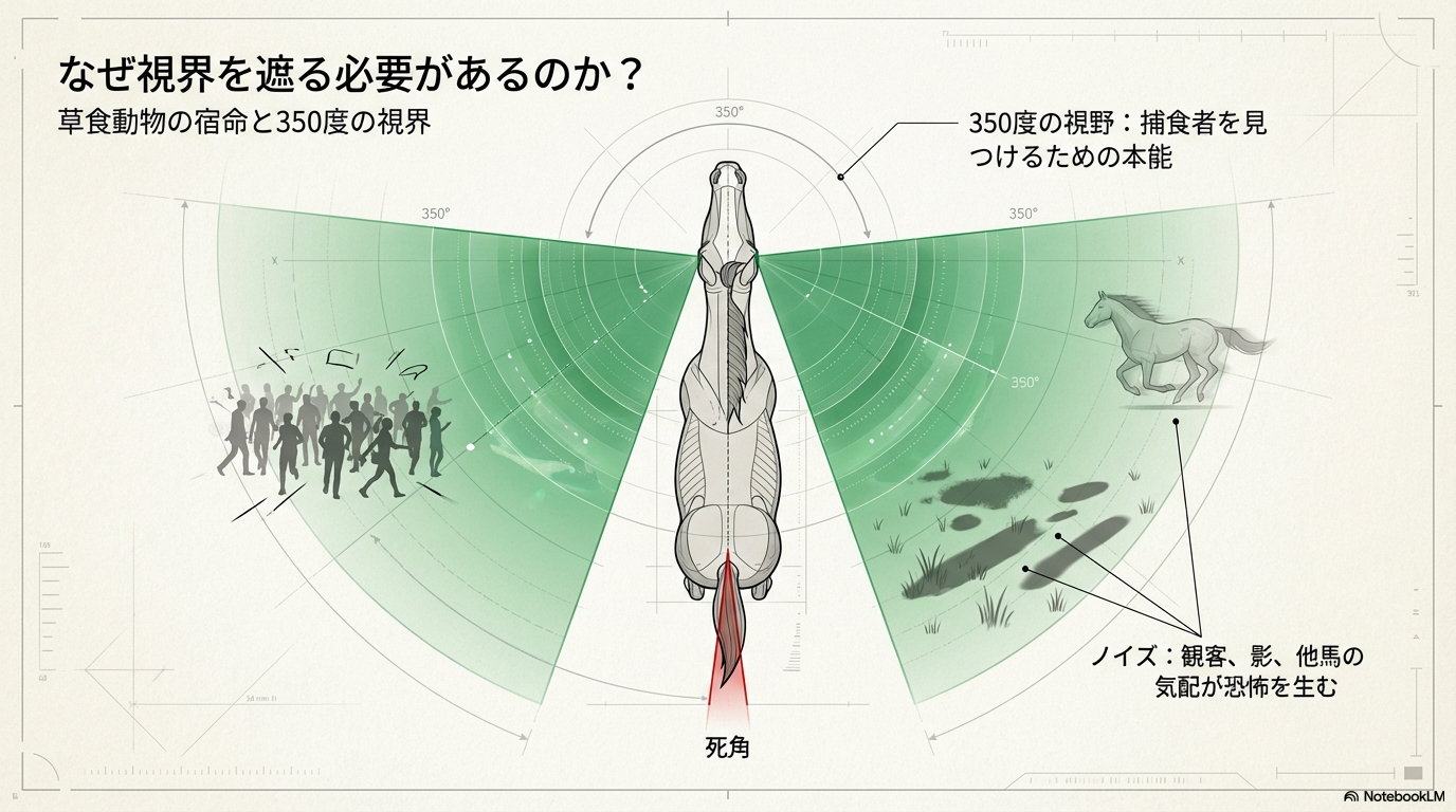 大歓声で揺れるスタンドの観客、芝生に落ちた影、コースの切れ目、そして背後から迫る他馬の気配。これら走る上で不要な情報まで脳に飛び込んでくると、馬は「敵がいるかもしれない」という本能的な恐怖を感じ、気が散って(物見をして)しまいます。その結果、真っ直ぐ走れなかったり、ブレーキをかけてしまったりするのです。