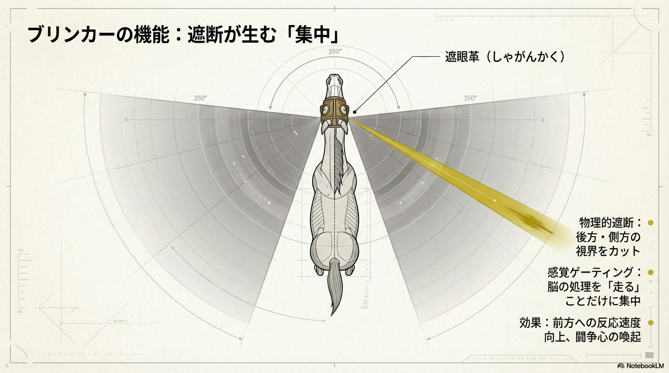 ブリンカーは、この過剰な視覚情報(ノイズ)を物理的にカットすることで、脳の処理能力を「走ること」だけに集中させるためのデバイスだと言えます。これは科学的にも「感覚ゲーティング」の一種として説明できる効果で、余計な入力を遮断することで、前方への反応速度を高めているわけです。