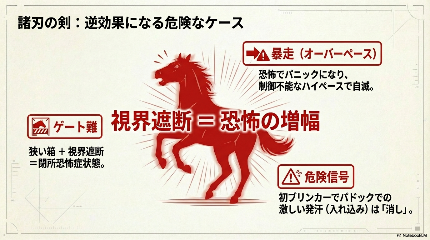 また、「ゲート難」のリスクも無視できません。ゲートという狭い箱に入れられた状態で、さらに視界まで塞がれると、閉所恐怖症のようなパニックを起こす馬がいます。中で立ち上がったり、突進したりして、最悪の場合は発走除外や大出遅れに繋がります。