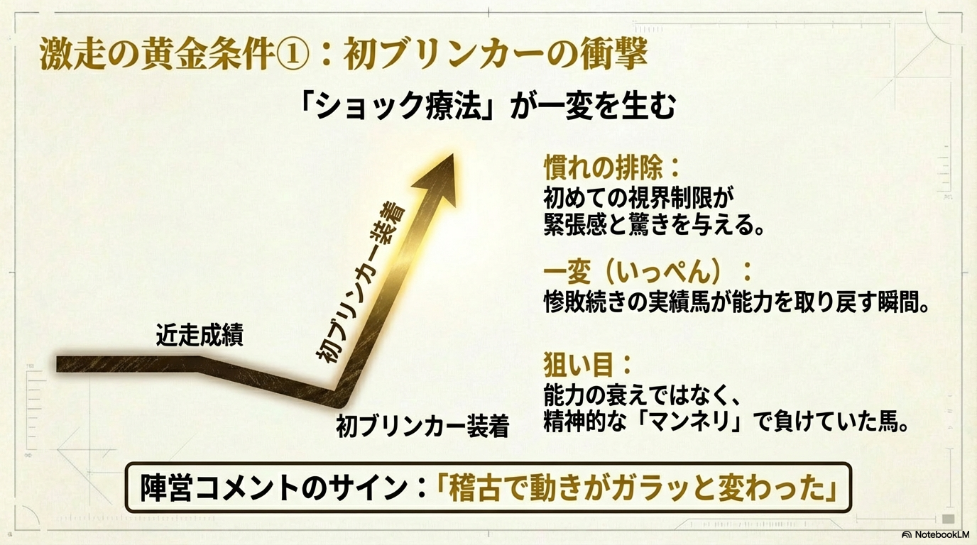 | 初ブリンカーか? | 馬にとって初めての視覚制限は、最も劇的な「一変」をもたらす。近走大敗馬の復活に注意。 |