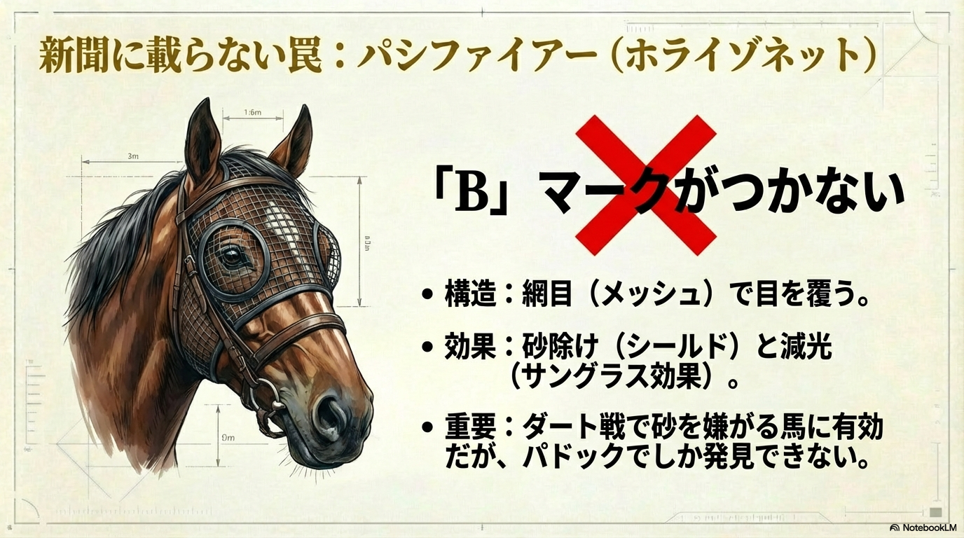 例えば、「パシファイアー(ホライゾネット)」がブリンカーに含まれるのかどうか、出走投票時の届け出が必要なのはどの馬具か、といったルールを知っておくことは、予想の前提条件として非常に重要です。