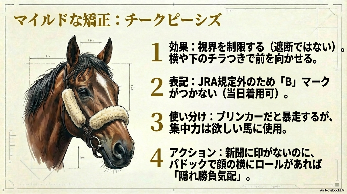 ちなみに、JRAの公式定義でも、チークピーシズは「遮眼革(ブリンカー)」とは区別されていますが、その効果は類似しているとされています。正しい知識を持ってパドックを見ると、馬の顔を見るのが楽しくなりますね。