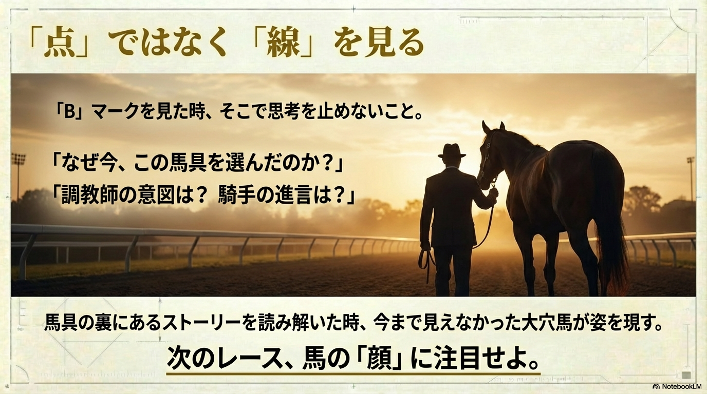 これが何を意味するかというと、文字情報だけで予想していると「重要な馬具変更」を見落としてしまうということです。「今回はブリンカー着用!」と大々的に報じられることはあっても、「今回はパシファイアー着用!」とはあまり書かれません。だからこそ、当日のパドック映像や、陣営の「今回はチーク(ホライゾネット)を着けてみる」といったコメントをチェックできる人が、他者と差をつけられるのです。