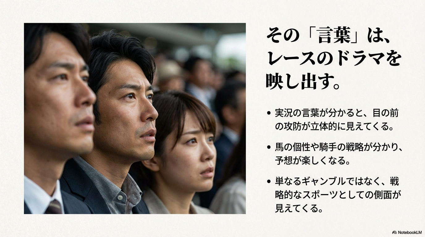 最初は耳慣れない言葉が多く、難しく感じるかもしれません。しかし、一つ一つの言葉が、レース中に繰り広げられるドラマ、競走馬や騎手の個性、そして勝敗を分ける微妙な要因を表現していると分かれば、覚えること自体が競馬の新たな楽しみ方になるはずです。