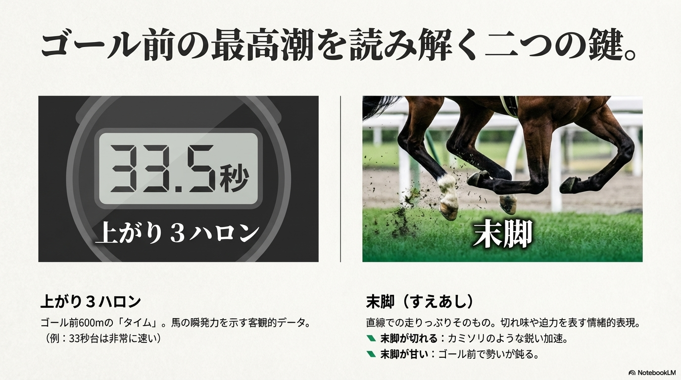 前述の「上がり3ハロン」がその結果を「タイム(数値)」で示したものであるのに対し、「末脚」はそのスパートの「質」や「見た目の迫力」を表現する言葉と言えます。