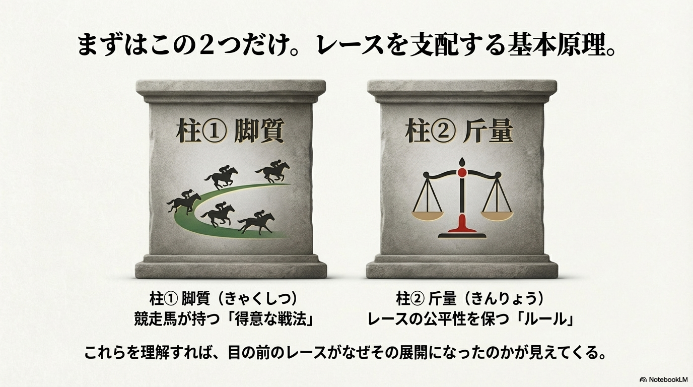 競馬を観戦し始めたばかりの方が、レース中継や新聞をより深く楽しむために、まず押さえておきたい基本的な用語があります。数ある用語の中でも、特にレースの勝敗に直結し、予想の根幹となるのが「脚質(きゃくしつ)」と「斤量(きんりょう)」の2つです。