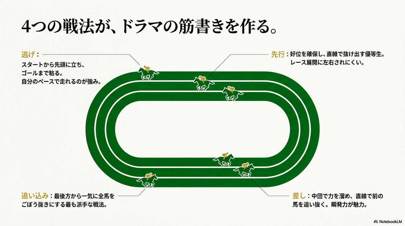 | 差し | レース中盤は中団(5~10番手あたり)で力を温存(脚を溜める)し、最後の直線で一気に前の馬たちを追い抜きます。 | レース前半が速い(ハイペース)と前の馬がバテるため、終盤で逆転しやすくなります。ゴール前の瞬発力が魅力です。 | 前の馬が壁になり、進路が見つからない(ドン詰まり)リスクがあります。また、ペースが遅いと前の馬がバテず、届かないこともあります。 |