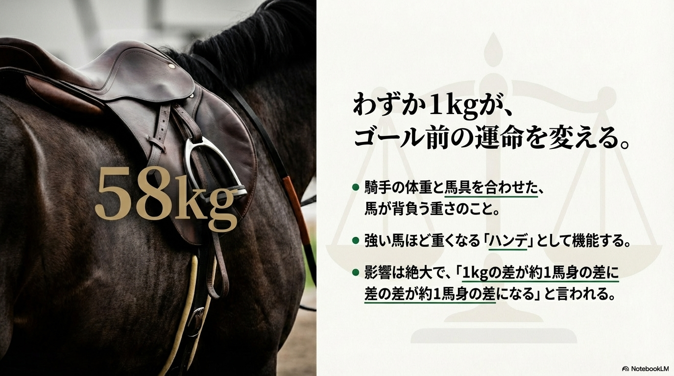 この斤量がレースに与える影響は非常に大きく、一般的に「1kgの差が、ゴール前で約1馬身(約0.2秒)の差になる」と言われることもあります。特にスタミナが問われる長距離レースや、最後の競り合いでは、このわずかな重さの違いが勝敗を分ける決定的な要因となるのです。
