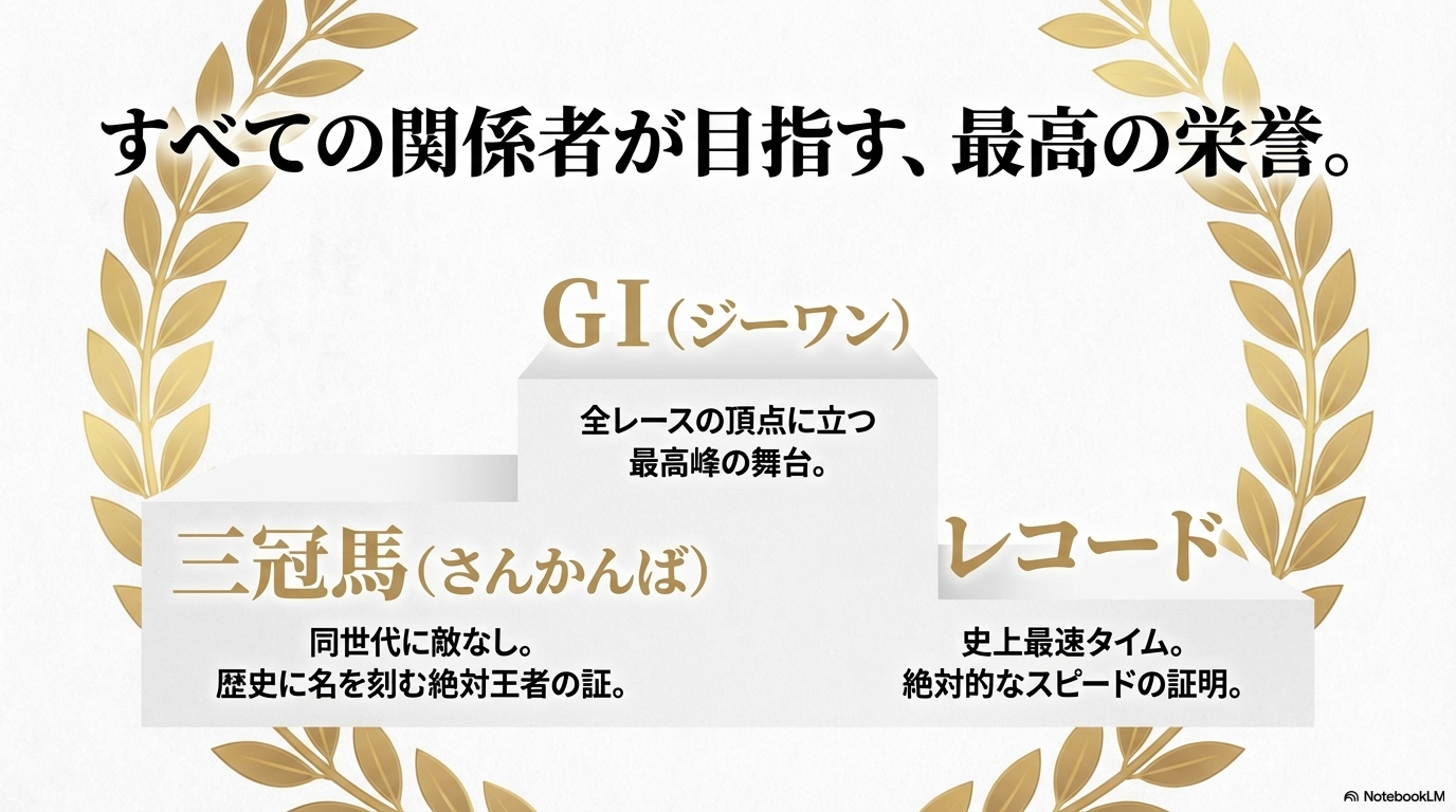これらは、競走馬や騎手、生産者などすべての競馬関係者が目指す最高の栄誉に関連する言葉です。競馬の「格」を示す重要な用語であり、これらの言葉を耳にすると、競馬ファンは特別なレースであることを即座に認識します。