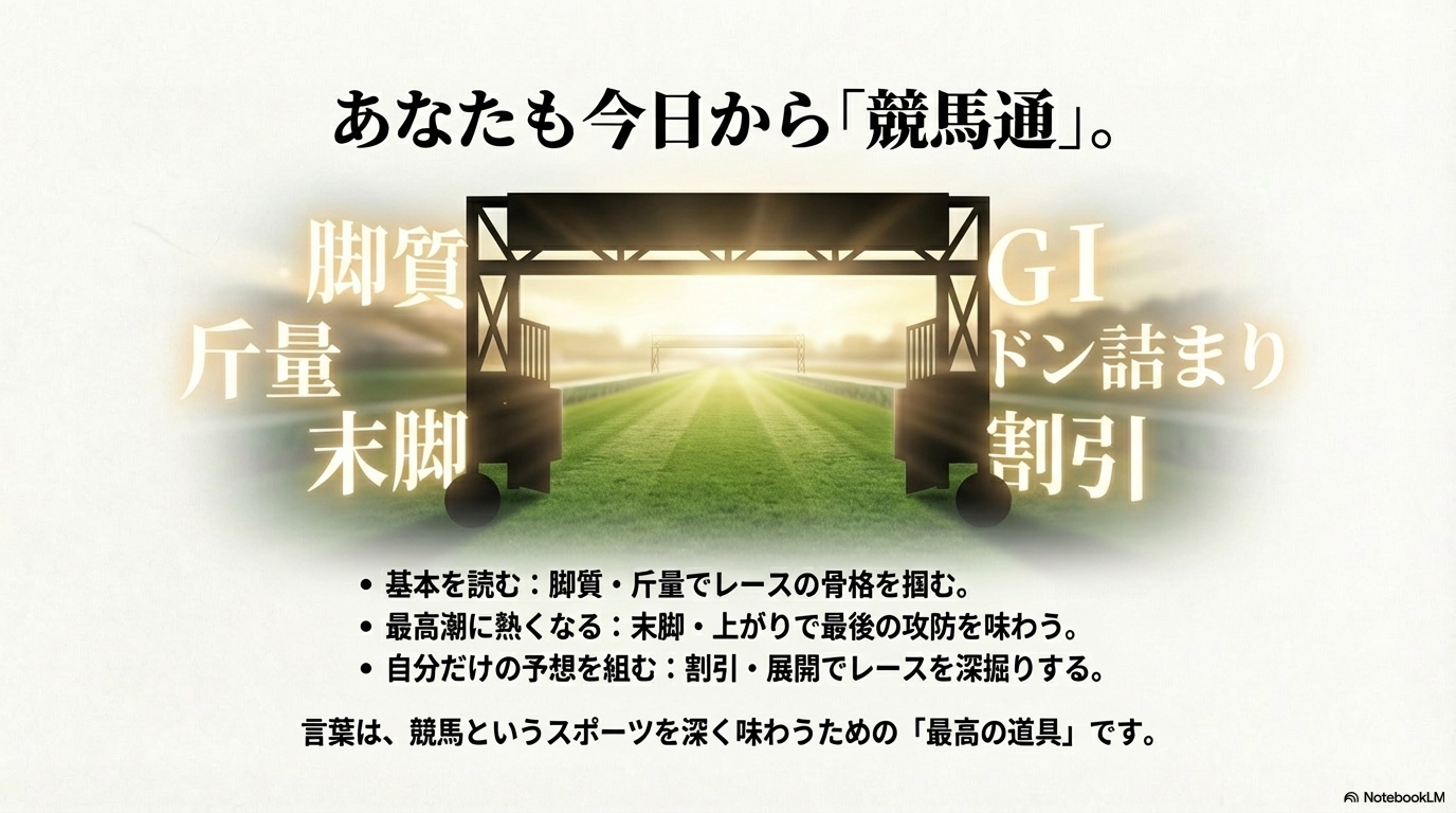 この記事を通じて、競馬用語の持つ意味や背景に触れ、少しでもその面白さを感じていただけたなら幸いです。最後に、今回ご紹介した特に重要な用語や概念を、改めて一覧で振り返ってみましょう。これらのポイントを押さえておけば、あなたも今日から「競馬通」への第一歩を踏み出せます。