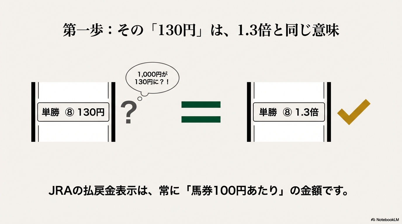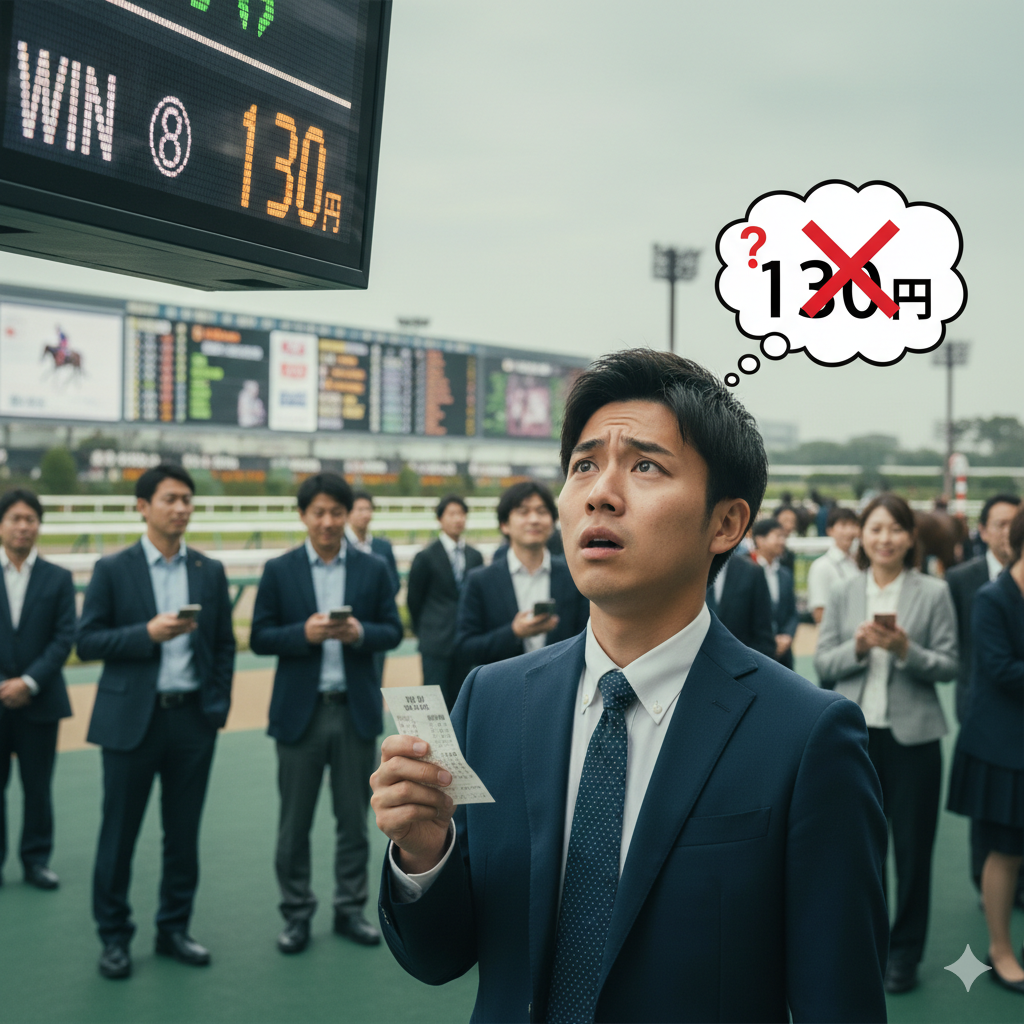 初心者が陥りやすい最大の誤解は、「130」という数字だけを瞬時に見て、「130倍の高配当だ!」と勘違いしてしまうケースです。特に馬券に慣れていないと、数字のインパクトに驚いてしまうことがあります。「130円」はあくまで「1.3倍」です。この「円」表示(払戻金)と「倍」表示(オッズ)の違いをしっかり区別することが、払い戻し計算を正確に行うための第一歩となります。