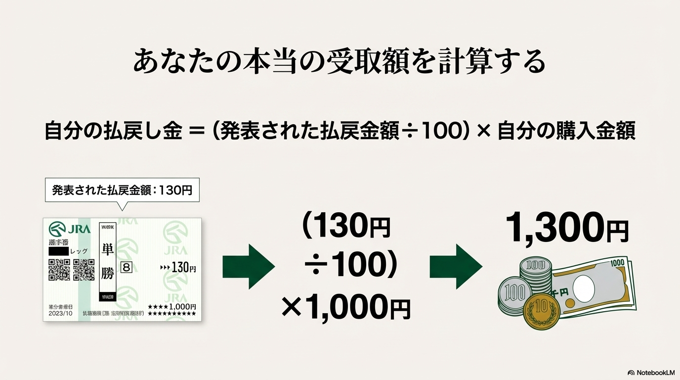 自分の払い戻し金 = (主催者発表の払戻金額 ÷ 100) × 自分の購入金額