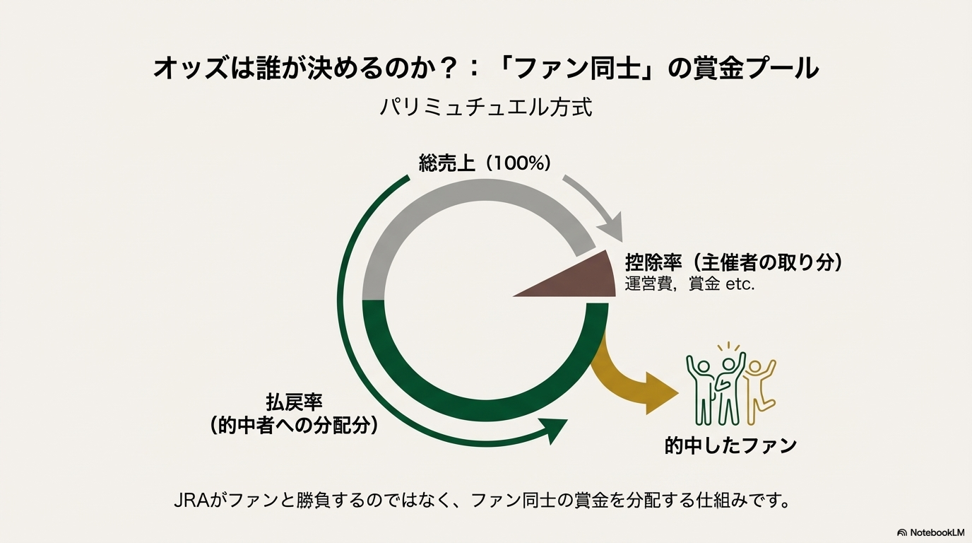 これは、JRAがファンと直接勝負する(例:カジノのルーレットのように胴元と客が勝負する)のではなく、あくまでファン同士の投票を取りまとめ、そこから法律で定められた一定の手数料(控除率)を引き、残った賞金プール(払戻率分の金額)を的中者全員で分配する、という方式です。
