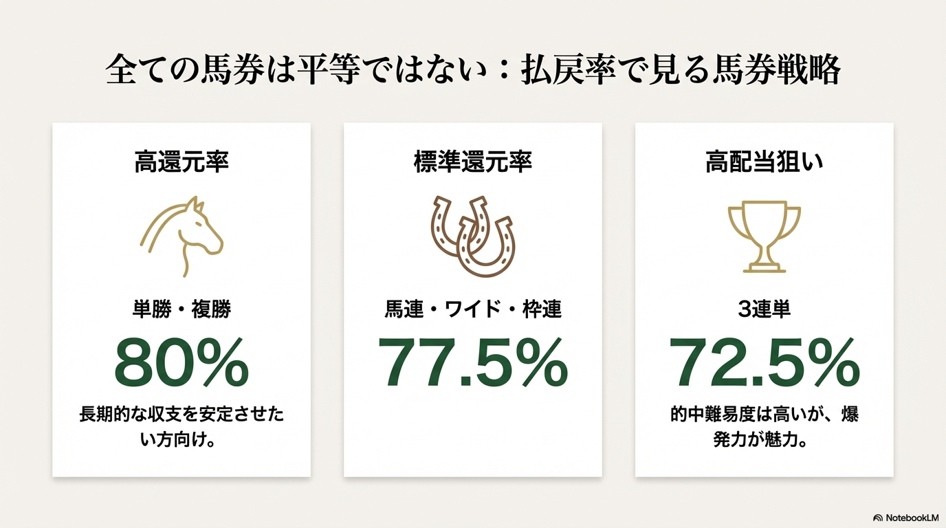 ご自身の予算や競馬へのスタンスに合わせて、どの券種をメインに勝負するかを決める上で、この「払戻率一覧」は非常に重要な基礎知識となります。